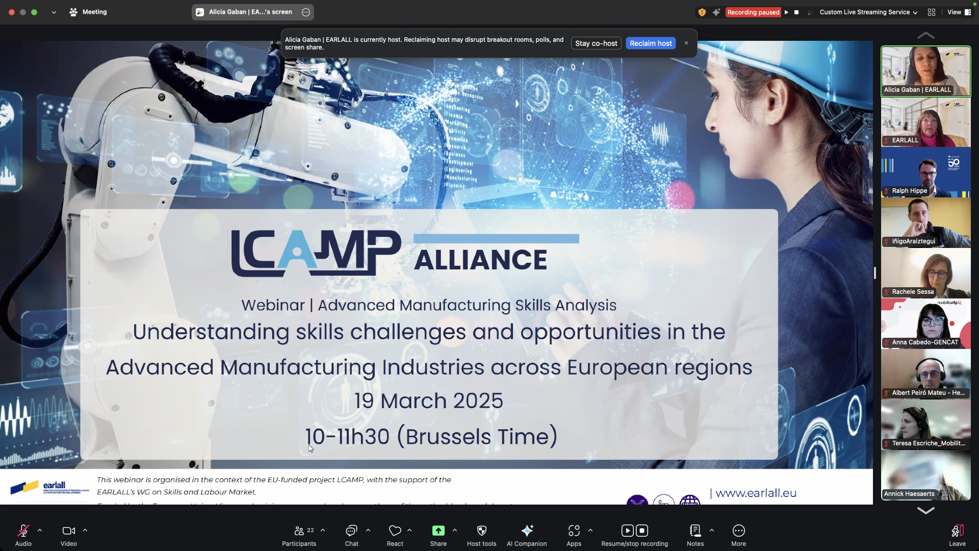 On 19 March 2025, the LCAMP Alliance, in collaboration with EARLALL, organised the webinar “Advanced Manufacturing Skills Analysis: Understanding Skills Challenges and Opportunities in AM Sectors across European Regions.” This event, part of EARLALL’s sector-focused skills analysis series, highlighted the importance of skills development in Advanced Manufacturing (AM) and showcased LCAMP’s work in supporting Vocational Education and Training (VET) centres across Europe.