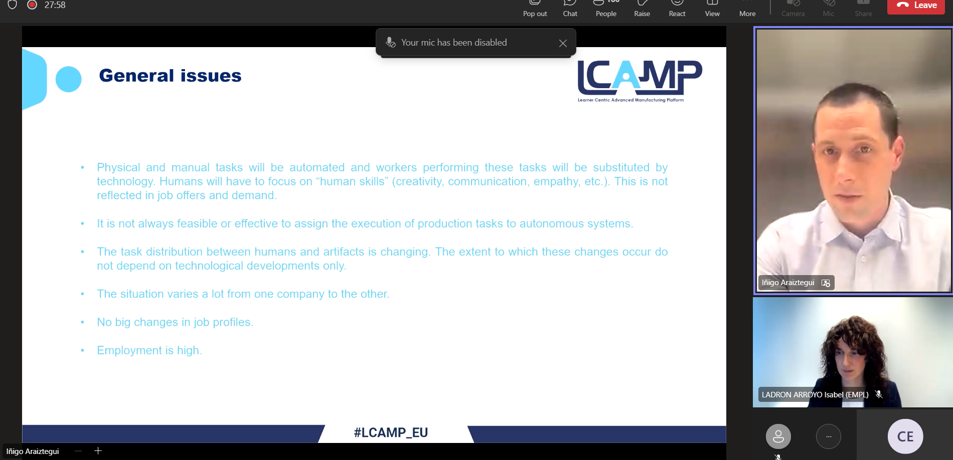 In the panel discussion focused on the manufacturing sector, Íñigo Araiztegui (TKNIKA), joined the discussion by introducing the findings of the LCAMP Skills and Jobs Observatory (WP3 led by Mécanic Valle and CMQE). The Observatory aims to provide up-to-date and user-friendly information on the current skills trends, gaps and skills prediction in Advanced Manufacturing. Mr Araiztegui explained that LCAMP will use the Skills and Jobs Observatory results to later support building training courses. In an initial work of the Observatory, the general issues identified are: