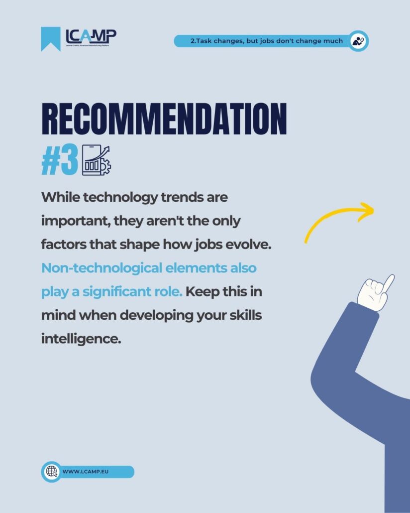 Furthermore, the analysis reveals that while job tasks may evolve, the core job roles remain relatively stable. Additionally, although technological advancements may appear to be transformative, non-technological tasks often play an equally critical role.