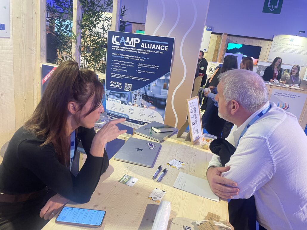 The stand featured TKNIKA, the Basque Country’s Centre for Innovation in VET, LCAMP project coordinator, showcasing cutting-edge practices in advanced manufacturing, digitalisation, and collaborative learning. Participants explored how LCAMP connects VET schools, regional authorities, and industry to co-create solutions that anticipate skills needs and strengthen regional innovation ecosystems.